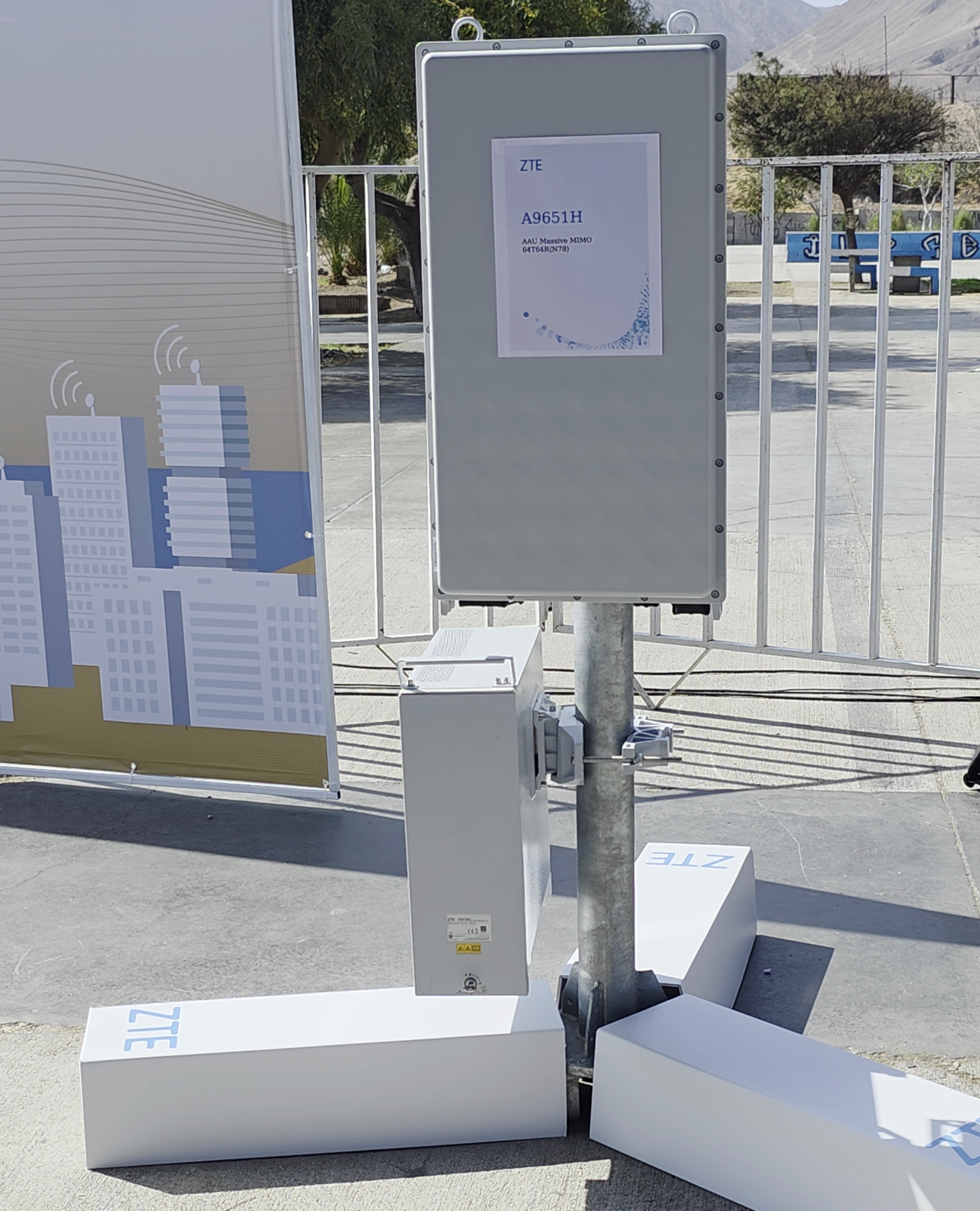 Para la red 5G, se incorporó la ZTE A9651H, una unidad activa de antena (AAU) Massive MIMO 64T64R, operando en banda N78 (3500 MHz). Esta antena es clave para escenarios urbanos densos, ya que permite beamforming dinámico y multiplexación espacial, optimizada para alto tráfico y eficiencia espectral en despliegues 5G NR.