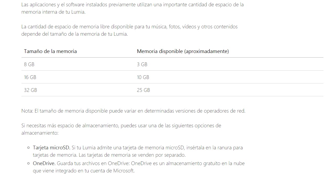 Como ven, el espacio restante que quedará en los dispositivos es bastante mínimo, por ejemplo las unidades con 8GB quedarán con espacio libre de 3GB, así mismo los que poseen 16GB de espacio quedarán con 10GB y los que tienen 32GB con 25GB libres respectivamente. Éste es un gran atentado a los dispositivos, ya que su memoria interna quedará mermada en gran parte. De todos modos Microsoft ofrece las alternativas de usar una MicroSD -si tu unidad posee la ranura-, o usar la nube de OneDrive que viene integrada con la cuenta.