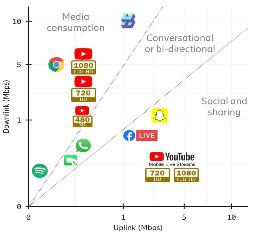 Asimismo, en el mismo gráfico se dibujan dos líneas que representan las frontera según el tipo de usuario, distribuidas en consumo plenamente para redes sociales (Social and Sharing), consumo multimedia y aquellos que oscilan entre estos dos grupos. De acuerdo a esto, el primer grupo requiere una gran velocidad de subida para compartir videos mediante streaming, y poca velocidad descarga. Por el contrario, el grupo que usa muchos datos en ver videos, requiere mayor velocidad de descarga que de subida.