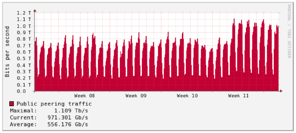 El siguiente gráfico muestra un aumento del 40% del consumo de datos móviles en en el punto de Intercambio MXP-IX de la ciudad de Milán, Italia, el día miércoles 9 de marzo, día que comenzó la cuarentena:
