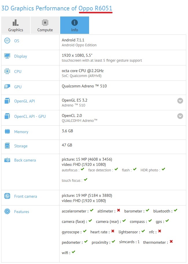 El sistema operativo móvil será Android 7.1.1 Nougat, aunque es de esperarse que esté recubierto por alguna capa de personalización de la firma china, pues en el benchmark figura la leyenda Android Oppo Edition.