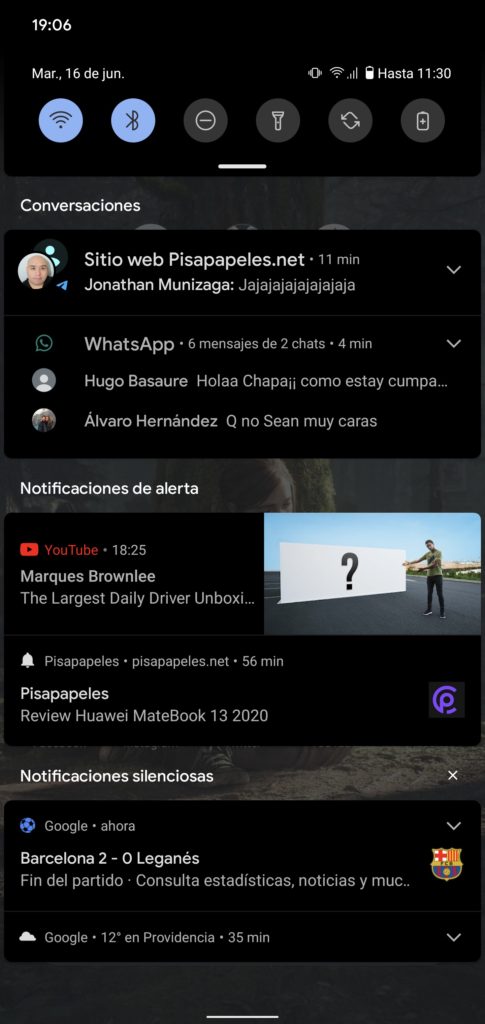 En alertas seguirán apareciendo las notificaciones del resto de aplicaciones, como el correo electrónico, las noticias o redes sociales, mientras que en las notificaciones silenciosas aparecerán las ya conocidas, como lo son los partidos de fútbol o el clima. Cabe destacar que podemos elegir que cualquier tipo de notificación sea silenciosa manteniendo pulsada una notificación, sin importar si son conversaciones u otras apps.
