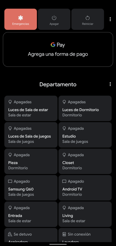 En la aplicación de ajustes podemos seleccionar que es lo que queremos que se muestra en el nuevo menú de encendido. Las tarjetas y pases no lo he podido probar porque no tengo ninguna tarjeta compatible con Google Pay pero los controles de dispositivos funcionan bastante bien.