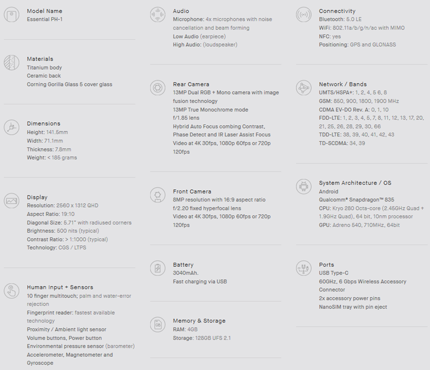 El dispositivo elimina el conector jack de 3.5 mm y lo reemplaza por un conector USB-C, el que además sirve para cargar el teléfono. Además incluye lector de huellas trasero y una batería de 3040 mAh con carga rápida. Essential, viene con Android Nougat.