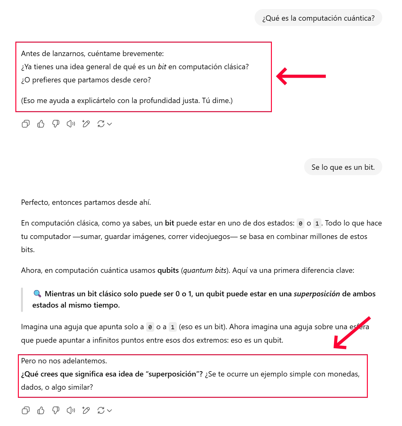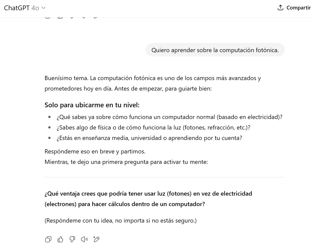Al abordar temas complejos, como computación fotónica o computación cuántica, la herramienta comienza consultando qué sabe el usuario sobre el tema. A partir de sus respuestas, adapta el nivel de detalle y, si detecta errores, evita corregirlos directamente y opta por nuevas preguntas que orientan al usuario hacia una mejor comprensión.