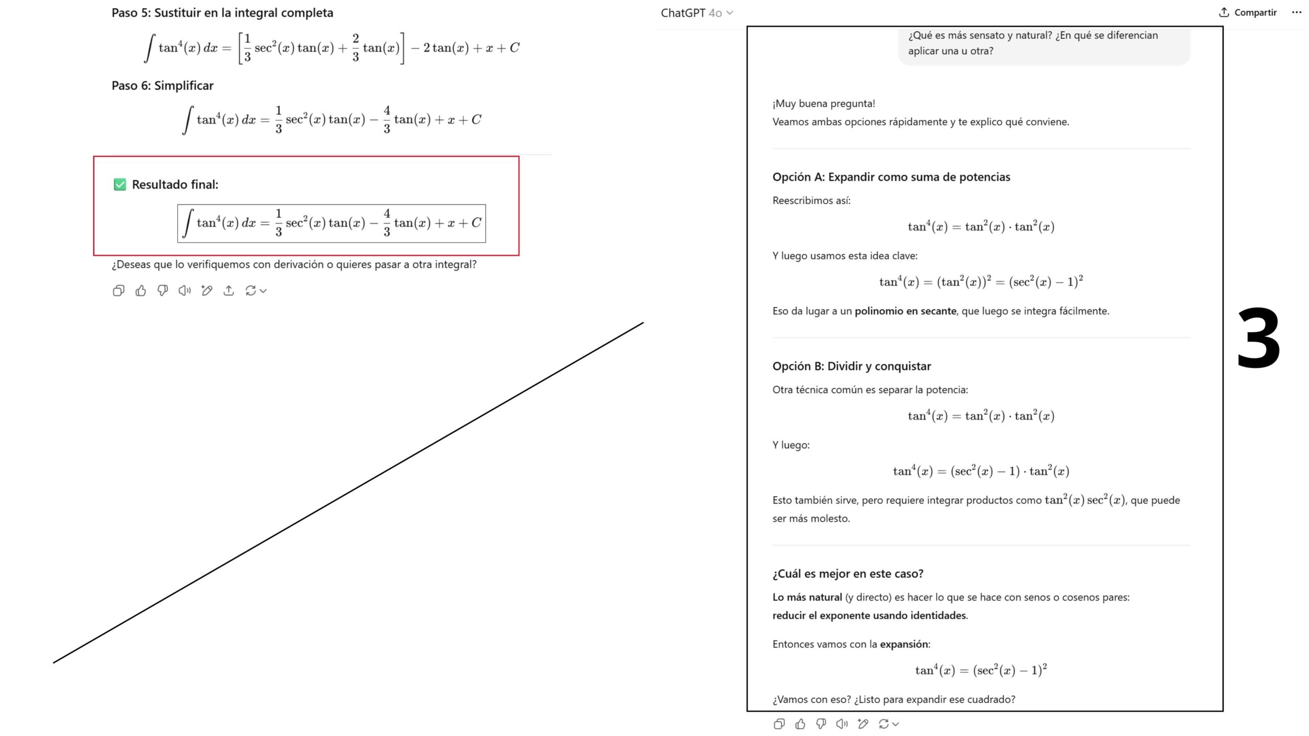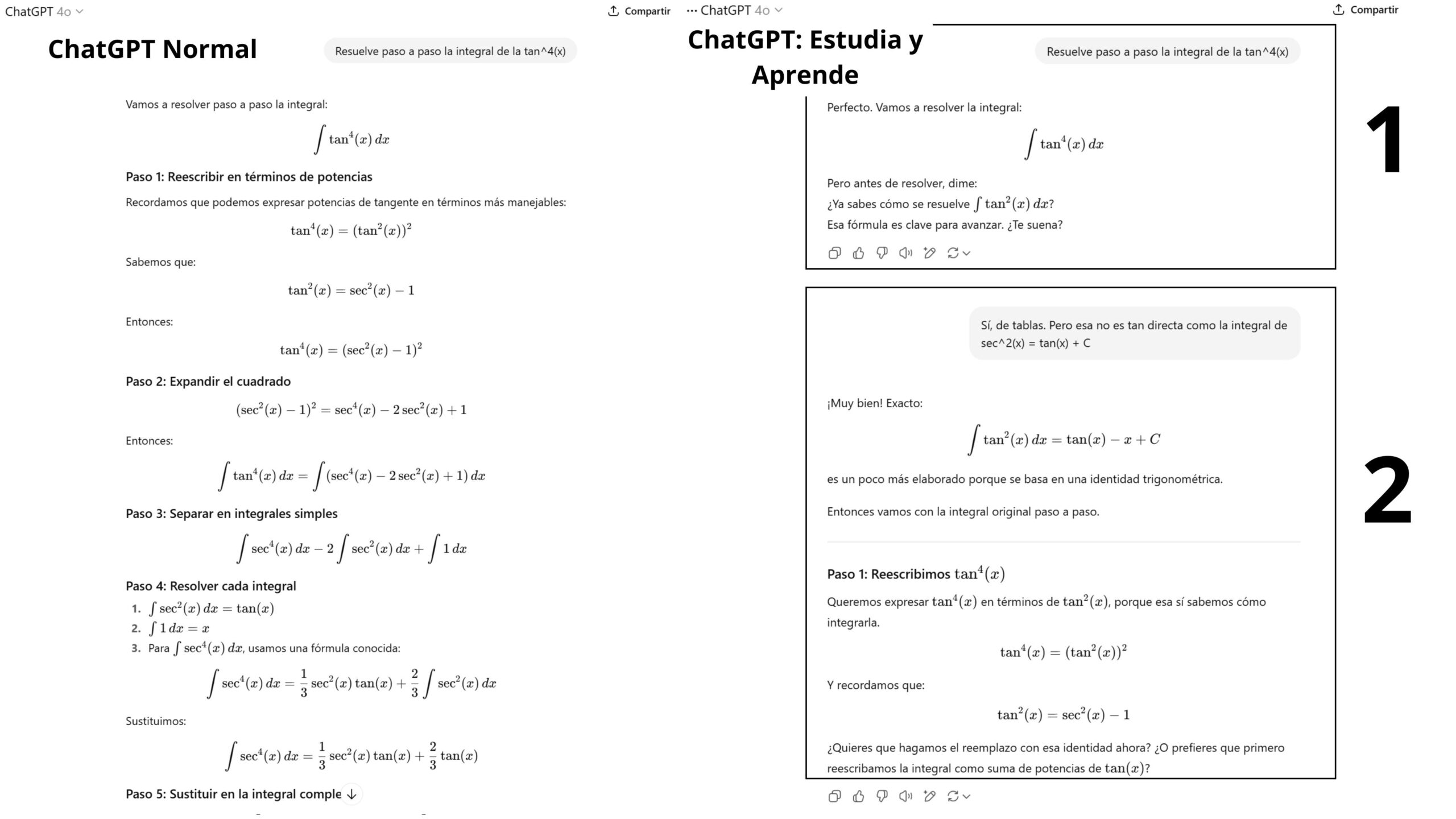 Por otra parte, “Estudia y aprende” permite resolver ejercicios paso a paso –aunque es algo que ya hacía–. Veamos un ejemplo con el chat en modo normal, y en el otro aplicando la herramienta, al solicitar que calcule una integral:
