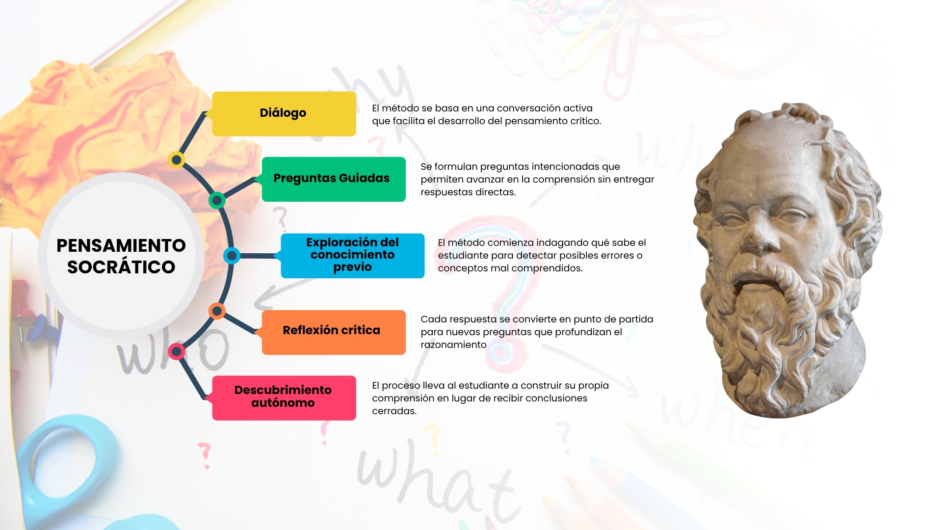 El pensamiento socrático es un método de enseñanza basado en el diálogo y la formulación de preguntas para estimular el razonamiento crítico. En lugar de entregar respuestas cerradas, busca que el estudiante descubra el conocimiento por sí mismo a través de una conversación guiada. Dado que ChatGTP actualmente no tiene competencia en esta materia, es lógico trabajar sobre esta área.