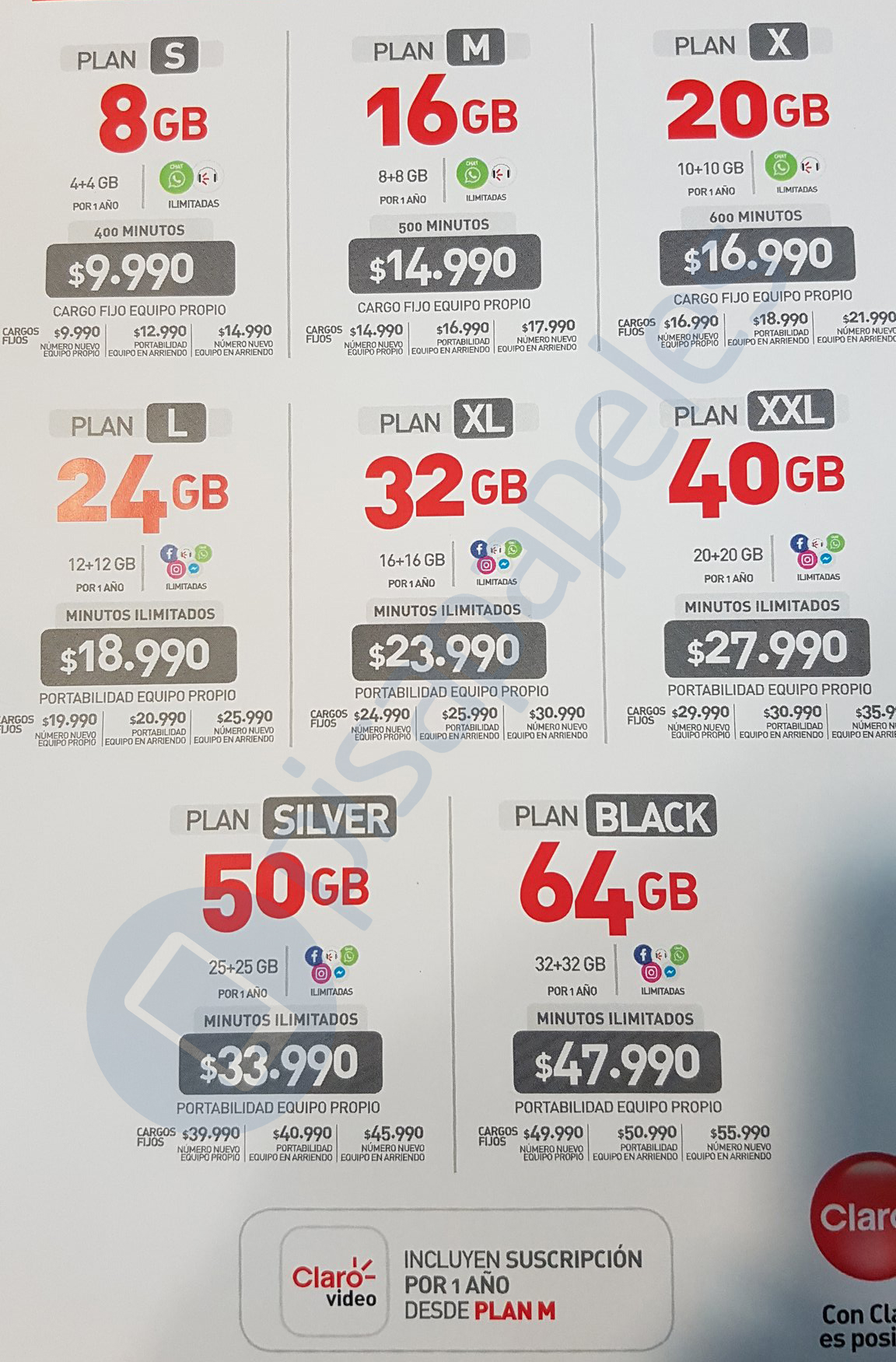 Cabe señalar que desde el Plan S hasta el Plan X tendrán WhatsApp y Claro Música con acceso ilimitado, mientras que desde el Plan L hasta el Plan Black contarán con acceso ilimitado a redes sociales Facebook, Instagram, FB Messenger, Claro Música y WhatsApp. Y desde el Plan M contarán con un año de suscripción a Claro Video.