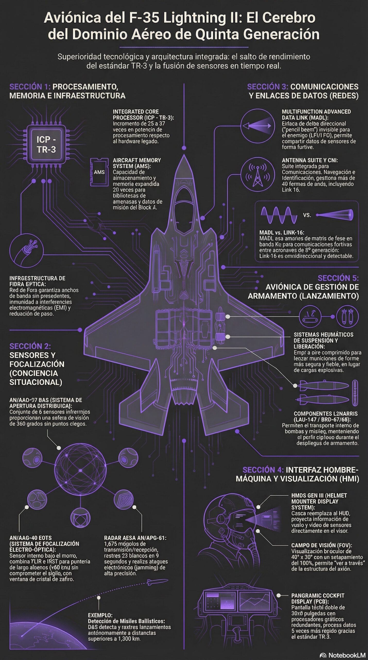 A continuación, se desglosa el ecosistema de aviónica avanzada del F-35 clasificado por tipos:
