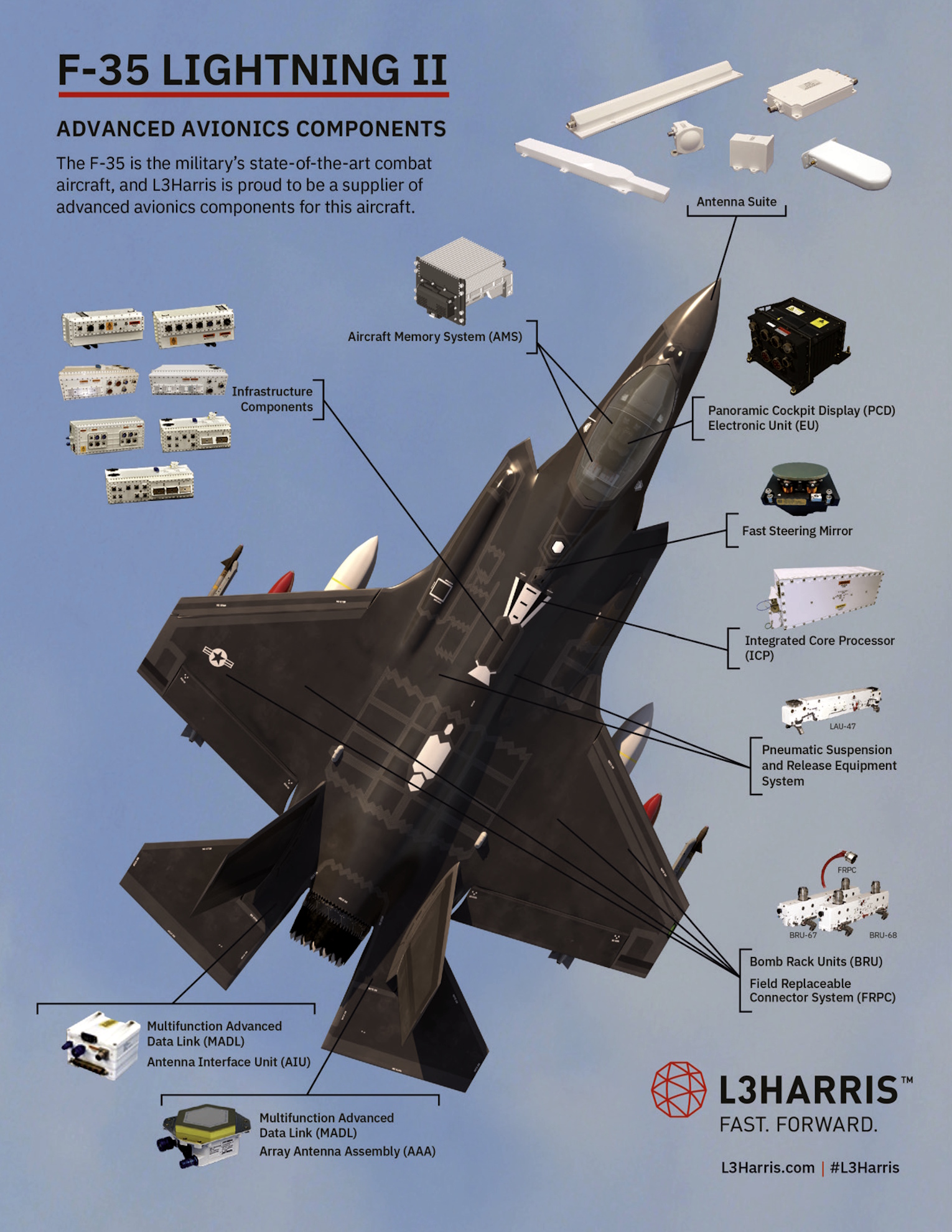 La siguiente infografía proporcionada por L3HARRIS, muestra de manera esquemática dónde se encuentran los componentes de la aviónica del F-35.