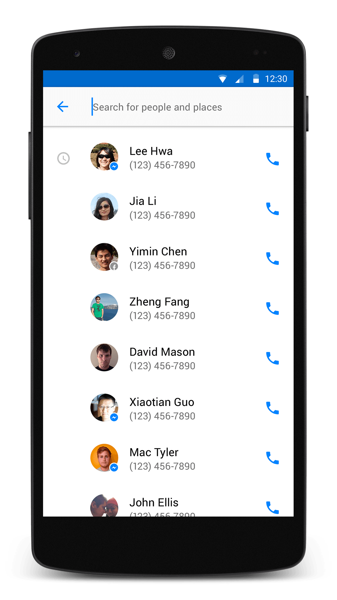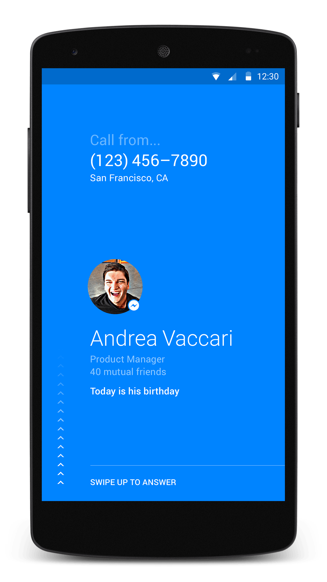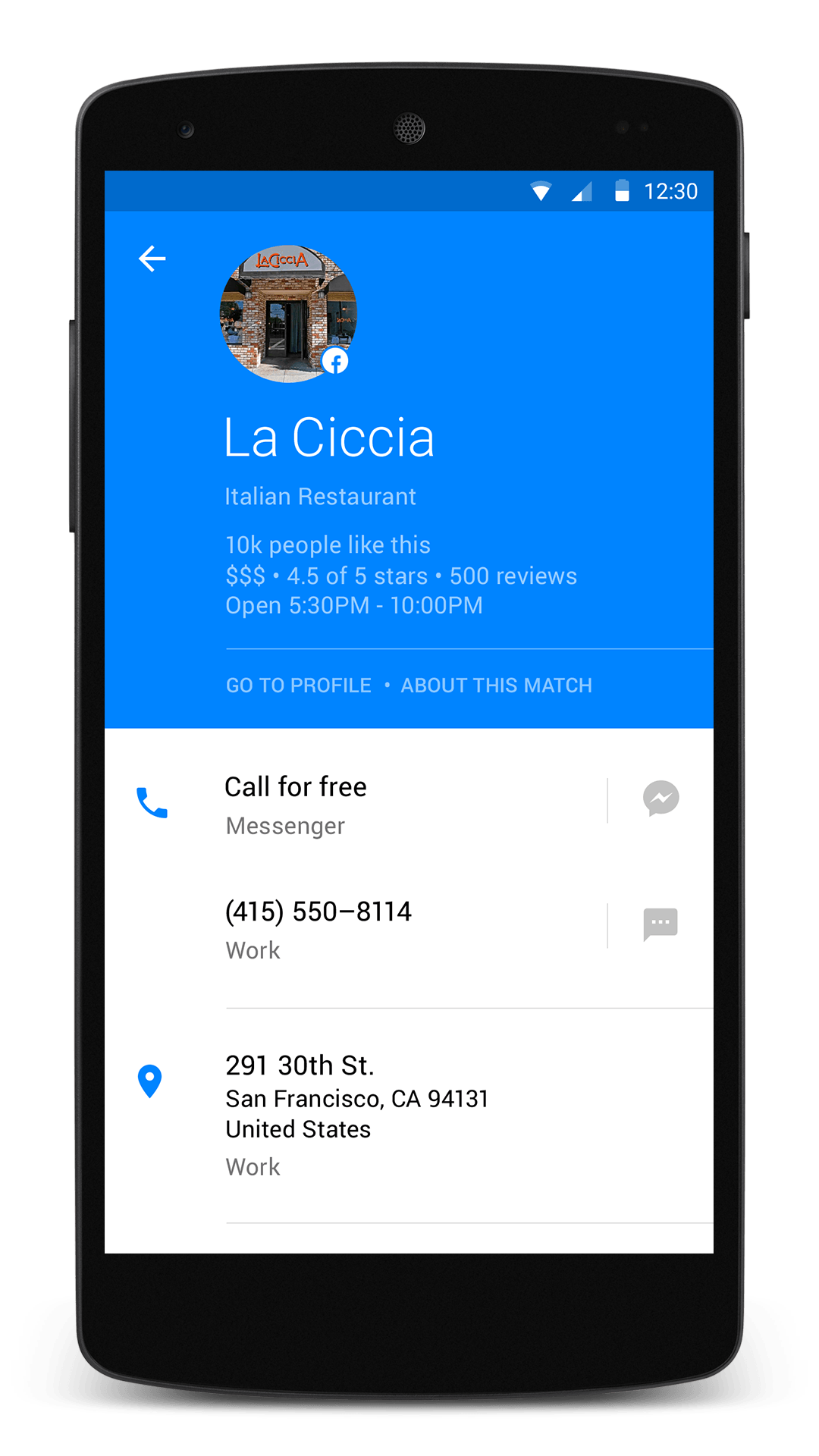 Otra característica muy útil es que al momento de recibir una llamada mostrará información sobre quién llama, incluso si no tienes ese número guardado en tu teléfono, sólo podremos ver información de las personas que ya han compartido con nosotros en Facebook. También puedes buscar a las personas y empresas en Facebook y llamarlos con un solo toque. Por ejemplo si un amigo te recomienda un nuevo restaurante de tu comida favorita, puedes utilizar Hello para encontrar su horario de atención, hacer una reserva y obtener direcciones, todo esto sin tener que salir de la aplicación.