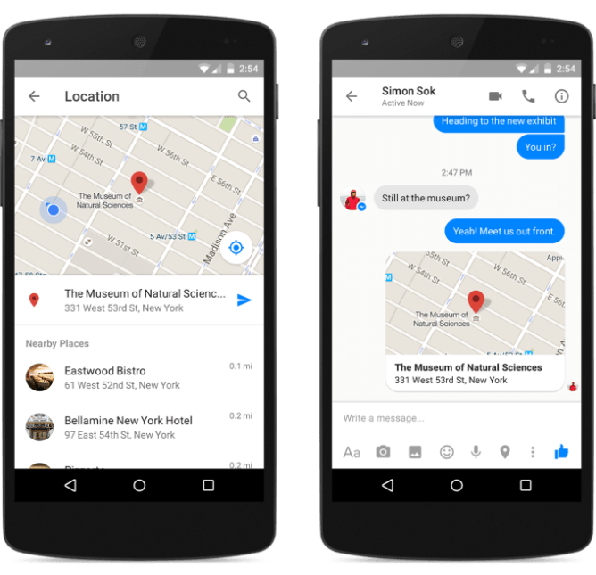 Con esta nueva actualización podrás compartir una ubicación específica, como por ejemplo la dirección de tu restaurante favorito o cualquier ubicación geográfica que necesites mostrar. La opción viene a hacer aún más social Facebook Messenger, entregando una alternativa útil a la hora de decidir un punto de encuentro con tu grupo de amigos de la red social o simplemente mostrar el lugar especifico de nuestra ubicación. Además existe un acceso al habitual botón «compartir ubicación», pudiendo seleccionar por medio del mismo una de las alternativas para mostrar una posición geográfica.