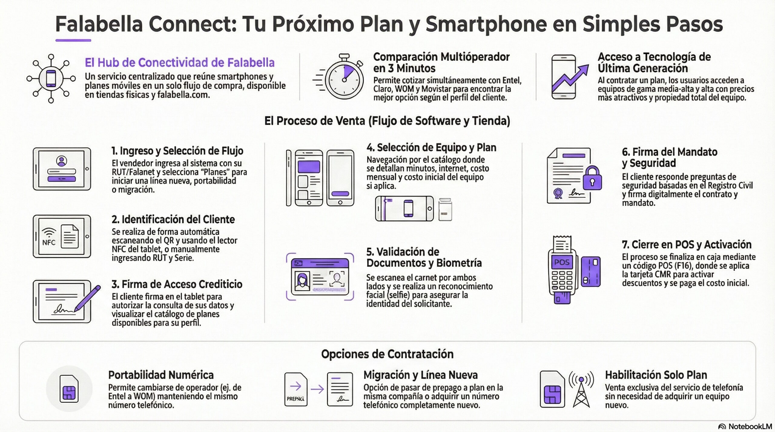 Ahí está uno de los puntos más interesantes del sistema, porque no se limita a mostrar teléfonos junto a planes en una misma pantalla. Lo que hace es encadenar identificación, revisión comercial, elección del equipo, validación biométrica, activación de beneficios con CMR y cierre en caja dentro de una sola secuencia, sumando además alternativas de renovación de equipo dentro de la propuesta comercial de Falabella.