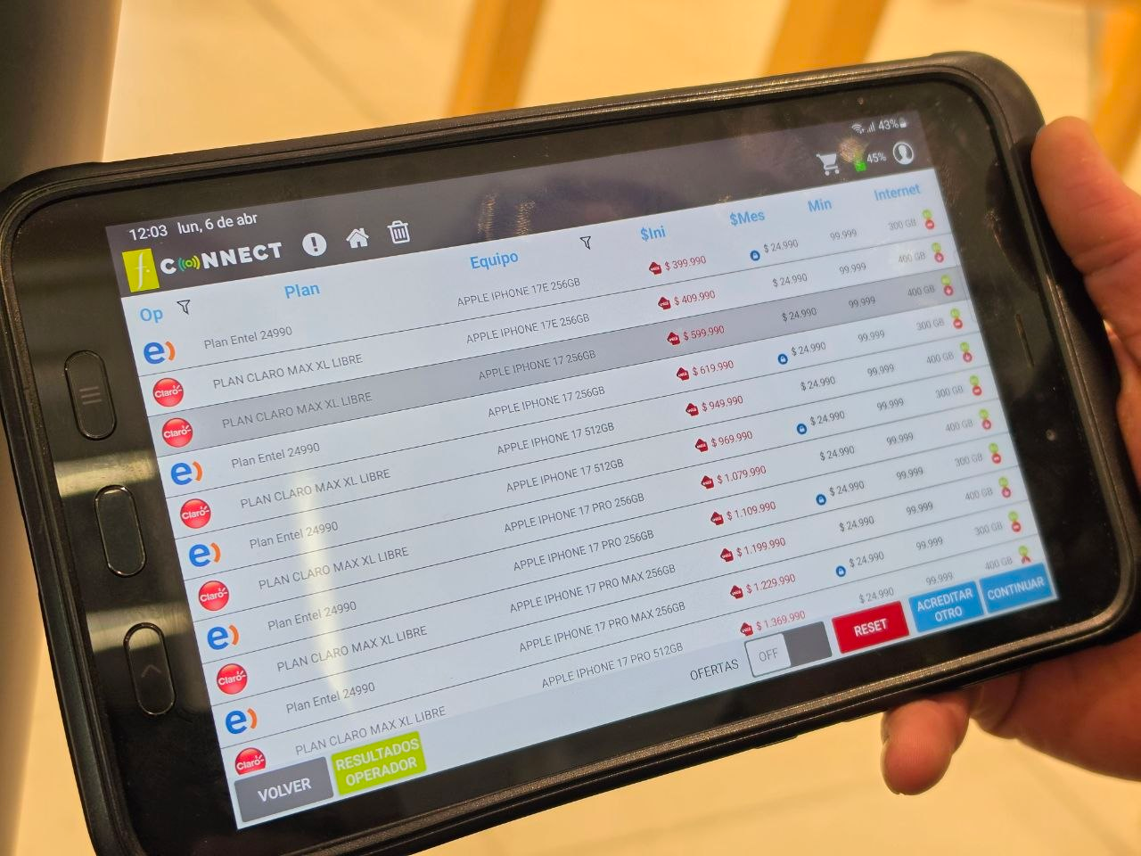 Con esa validación hecha, el vendedor puede recorrer el catálogo junto al cliente y revisar operador, cargo mensual, minutos, datos y, cuando corresponde, el costo inicial del equipo. En ese mismo entorno también se abren distintos escenarios de venta, porque el sistema no trabaja solo con línea nueva, sino también con portabilidad, migración desde prepago a plan dentro de la misma compañía y habilitaciones de solo plan.