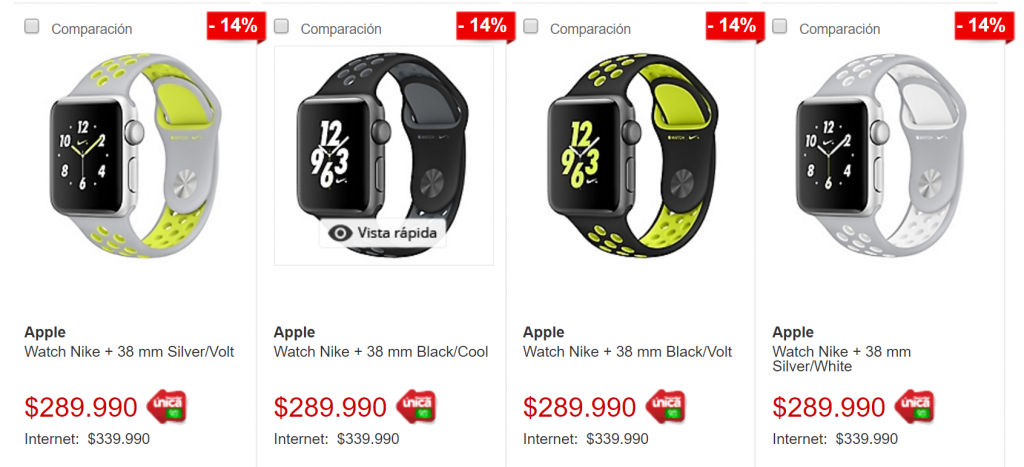 Finalmente, encontramos un descuento interesante en el Apple Watch Series 2. La variante de 38mm está a un precio de CLP $289.990, mientras que el de 42mm está a CLP $319.990. También es oferta única con tarjeta CMR.
