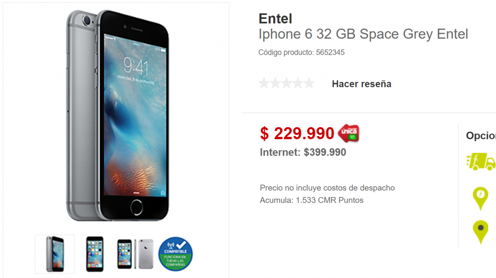 Quizás la oferta más atractiva es la del iPhone 6 de 32GB, que está a un precio de CLP $229.990 si pagas con tarjeta CMR. Este precio es bastante bueno para ser un equipo liberado, ya que está cercano al nivel de precios que alcanzan dispositivos de Apple aún más antiguos.