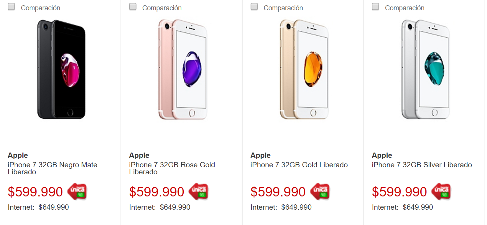 En primer lugar encontramos un pequeño descuento en el iPhone 7 de 32GB, teniendo un precio de CLP $599.990. Sí, es un descuento pequeño pero que se agradece para quienes ya estaban decididos a comprar el equipo. Esta oferta es exclusiva con tarjeta CMR.