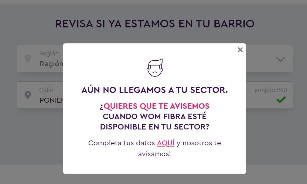 En la misma web del operador WOM te ofrece revisar si tienes factibilidad técnica en tu sector o no. Sin embargo, NO LO USES Y NO CONFÍES EN EL, pues en este apartado han estado algo flojitos y está totalmente desactualizado.
