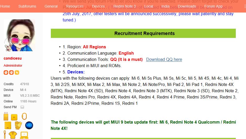 De acuerdo a la misma página de Xiaomi, en su foro oficial existe un tema en el que se necesitan personas para convertirse en beta testers para MIUI 9, pero lo curioso es que están solicitando personas para todos los dispositivos que actualmente tienen MIUI 8, menos la recientemente presentada Mi Pad 3. Así, la lista ahora incluye a los Mi 6, Mi 5s Plus, Mi 5s, Mi 5c, Mi 5, Mi 4S, Mi 4c, Mi 4, Mi 3, Mi 2/2S, Mi MIX, Mi Max 2, Mi Max, Mi Note 2, Mi Note/Pro, Mi Pad 2, Mi Pad 1, Redmi Note 4X (MTK), Redmi Note 4X (SD), Redmi Note 4, Redmi Note 3 (MTK), Redmi Note 3 (SD), Redmi Note 2, Redmi Note, Redmi Pro, Redmi 4X, Redmi 4A, Redmi 4, Redmi 4 Prime, Redmi 3S/Prime, Redmi 3, Redmi 2A, Redmi 2/Prime y hasta los Redmi 1S y Redmi 1.