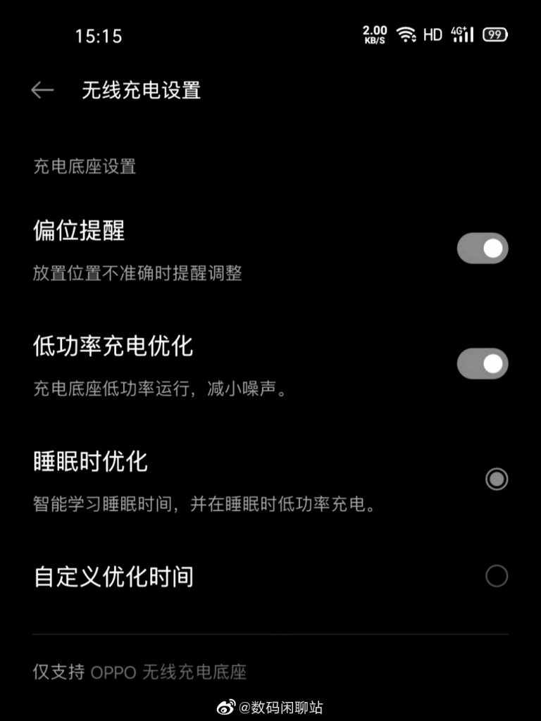 El teléfono insignia de Oppo soportaría carga inalámbrica a 30 W. Eso es mucha potencia de por sí, y más por ser inalámbrica. Hay teléfonos que en la actualidad se presentan con carga por cable con menor velocidad. Junto con esa cualidad también vendrían agregados pensados para la misma, como «deshabilitar cuando la batería está demasiado baja» y «optimizar durante el sueño», entre otras.