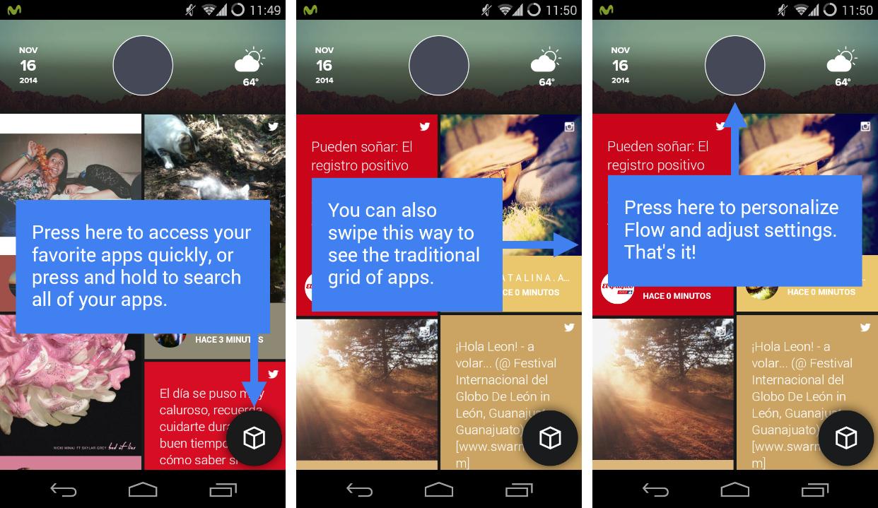 Flow Home está diseñado para los amantes de las redes sociales y nos permitirá aglutinar los feeds de Facebook, Twitter, Instagram, Tumblr y además nuestras notificaciones, en una pantalla para visualizarlas de forma amigable.