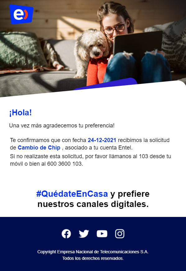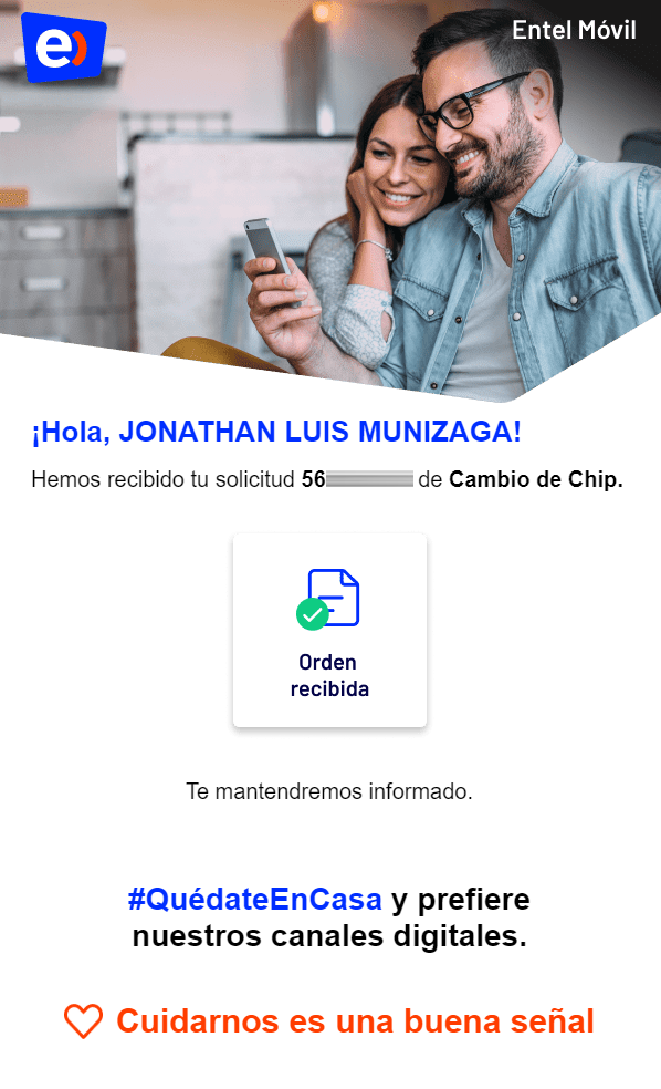 La ejecutiva me confirma mi correo electrónico, yo le digo que está correcto. Luego me dice que me llegarán tres emails, el primero me informará que se realizará el cambio a eSIM, el segundo me entregará el código de la solicitud, y el tercero tendrá instrucciones para instalar la eSIM junto con un código QR.