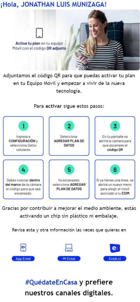 La ejecutiva me dice que está todo listo y me pregunta si necesito algo más, yo le digo que eso sería todo, nos despedimos y me retiro de la sucursal feliz con mi eSIM de Entel.