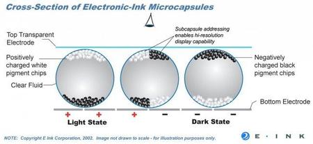 Primero que todo, mencionar que existen dos tipos de tinta electrónica: Gyricon (de la empresa Xerox) y E-Ink, siendo esta última la más utilizada en la gran mayoría de los libros electrónicos ya que con ésta se consigue una mejor definición de imagen.