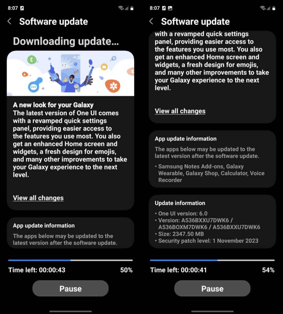 La actualización fue vista por primera vez en el Reino Unido. La versión de firmware de la actualización estable de Android 14 del Galaxy A53 es la A536BXXU7DWK6. El peso de la descarga es de 2.3 GB e incluye también el parche de seguridad actualizado a noviembre de 2023.