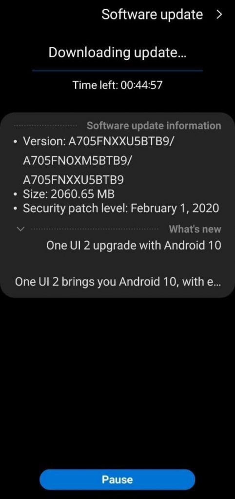 La captura superior a estas líneas corresponde a la de un usuario de un Galaxy A70 a punto de descargar el paquete. Vemos que el número de la versión de firmware es A705FNXXU5BTB9.