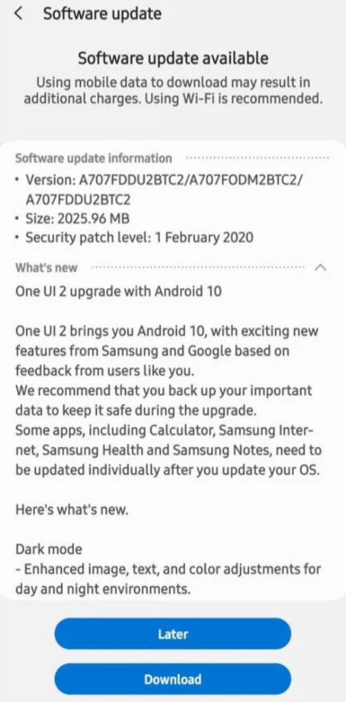 La imagen superior a estas líneas corresponde a un Galaxy A70s a punto de actualizar. El número de versión de firmware es A707FDDU2BTC2 y los usuarios de India son quienes avisaron en primera instancia de su existencia.