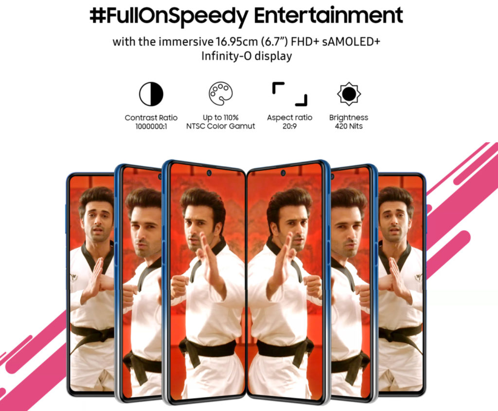 La pantalla es Super AMOLED de 6,7 pulgadas a resolución 1080 x 2400 píxeles con una relación de aspecto 20:9 y un brillo máximo de 420 nits. La cámara frontal se encuentra perforada en dicho display.