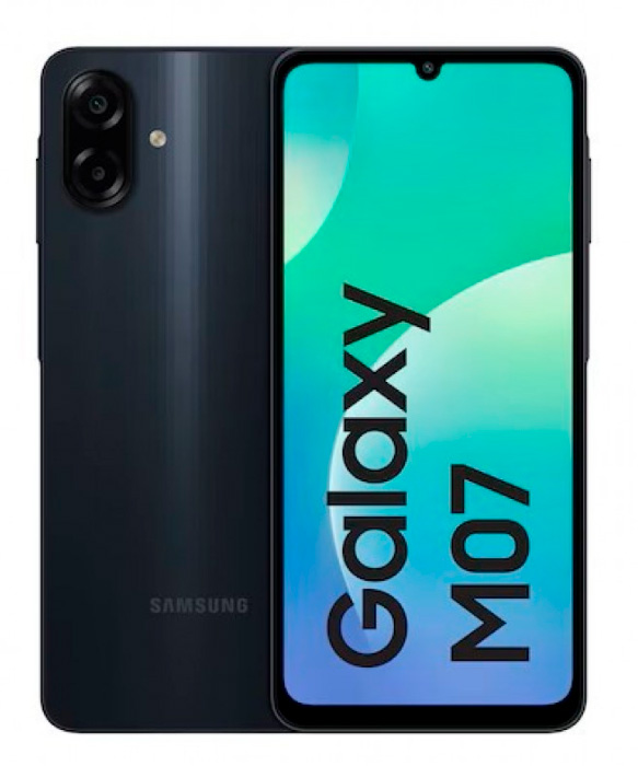 Este Galaxy M07 mide 167,4 x 77,4 x 7,6 milímetros y pesa 184 gramos. Su pantalla es LCD de 6,7 pulgadas a resolución 720 x 1600 píxeles. La tasa de refresco se ubica en 90 Hz.