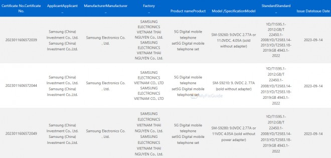 Por su parte, los Galaxy S24+ (SM-S9260) y S24 Ultra (SM-S9280) mantendrán también las velocidades de 45 W de sus predecesores. También se puede confirmar que los teléfonos no contarán con el cargador en la caja.