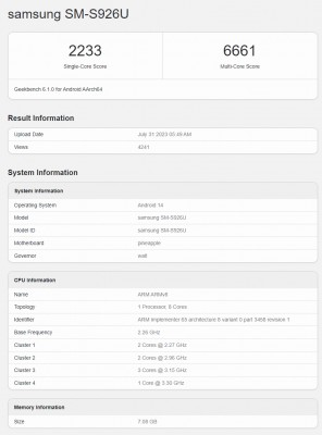 Tal como podemos ver en Geekbench, el S24+ que pasó por sus sitios dejó interesantes conclusiones. La primera tiene que ver con la configuración que tendrá el procesador. Se trata, entonces, un núcleo principal a 3.30 GHz, tres núcleos de rendimiento a 3.15 GHz, dos más a 2.96 GHz y, por último, dos núcleos de eficiencia a 2.27 GHz.