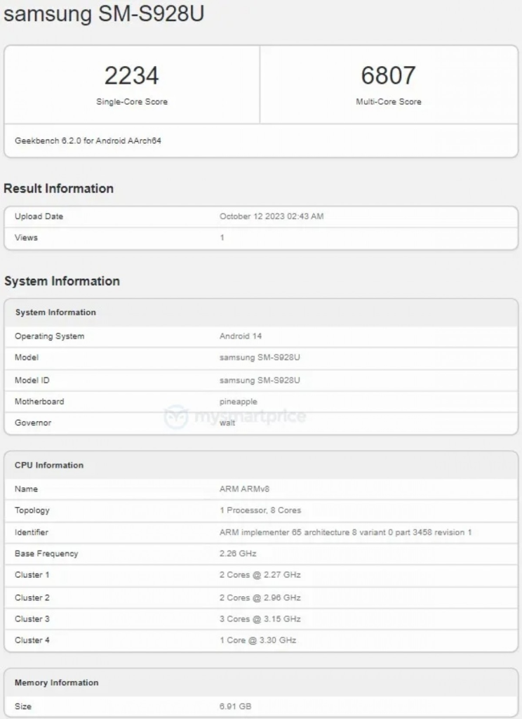 Así, el dispositivo con nombre clave SM-S928U aparece usando el procesador Snapdragon 8 Gen 3. Este procesador tendrá una configuración de CPU 1+3+2+2. El primer núcleo funciona a 3.30 GHz, el segundo clúster tiene tres núcleos a 3.15 GHz, el tercero tiene dos unidades a 2.96 GHz y los dos núcleos restantes funcionan a 2.27 GHz.