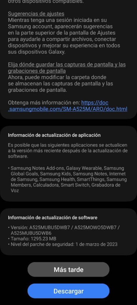 La captura de arriba es la de un Galaxy A52 (4G) a punto de actualizar. El paquete completo pesa 1.295,23MB. Recomendamos ubicarte bajo una red Wi-Fi por el bien de tus datos móviles. La versión de software puede ser A525MUBU5DWB7 / A525MOWO5DWB7 / A525MUBU5DWB6.
