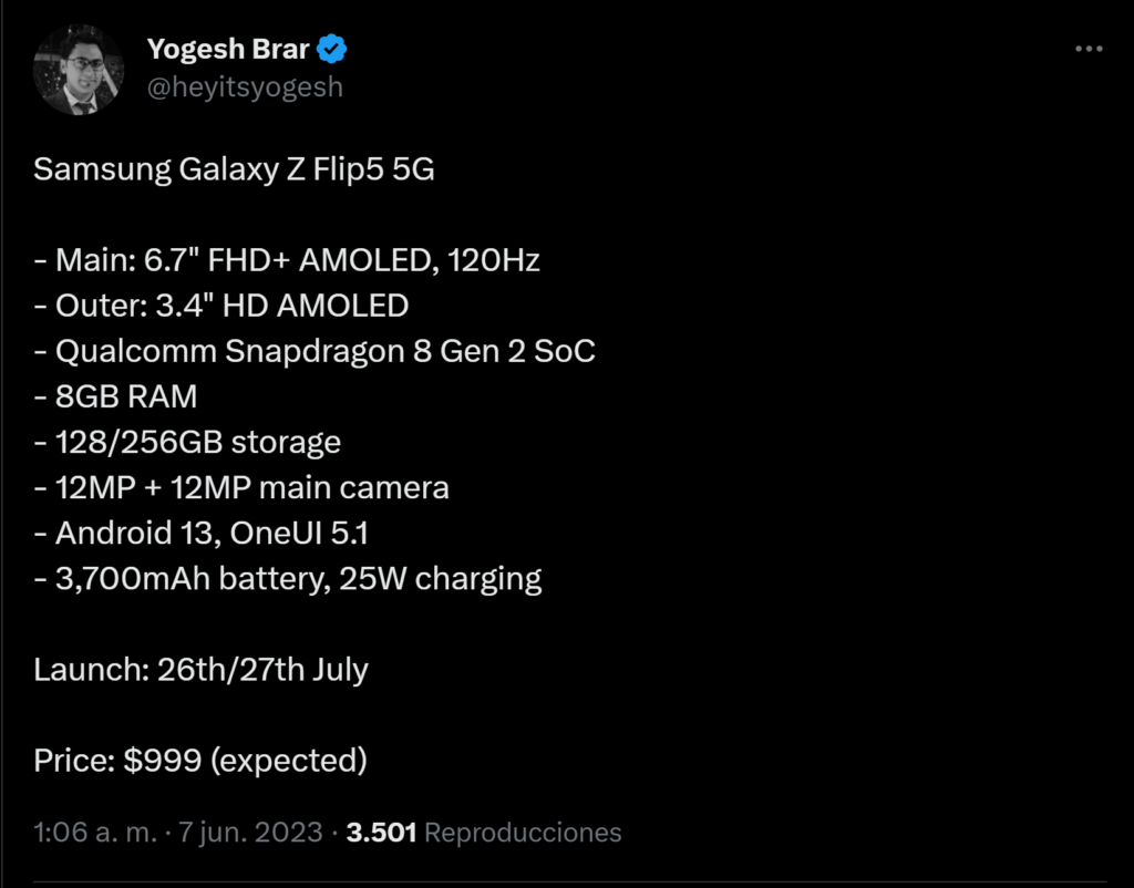 Hoy, ha sido Yogesh Brar el que ha dado con esta nueva ronda de rumores. En la misma destacan que la pantalla externa será de 3.4 pulgadas con resolución HD. La pantalla interna de este Flip5 será de 6.7 pulgadas con tasa de refresco de 120 Hz. Esto es claramente inferior al Razr 40 Ultra presentado recientemente por Motorola.