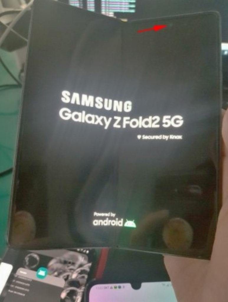 De manera sutil se visualiza que aquí no habría notch como en el Galaxy Fold, sino una cámara frontal perforada en pantalla. Esa lente tendría 10MP.