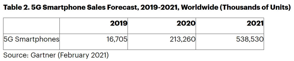 Los móviles con 5G representarían el 35% de venta en smartphones en general a nivel mundial. Si esto se cumple, se distribuirían más de 538.5 millones de unidades con dicha tecnología (el gráfico de arriba puede confundir en cifras porque está expresado en cientos de unidades).