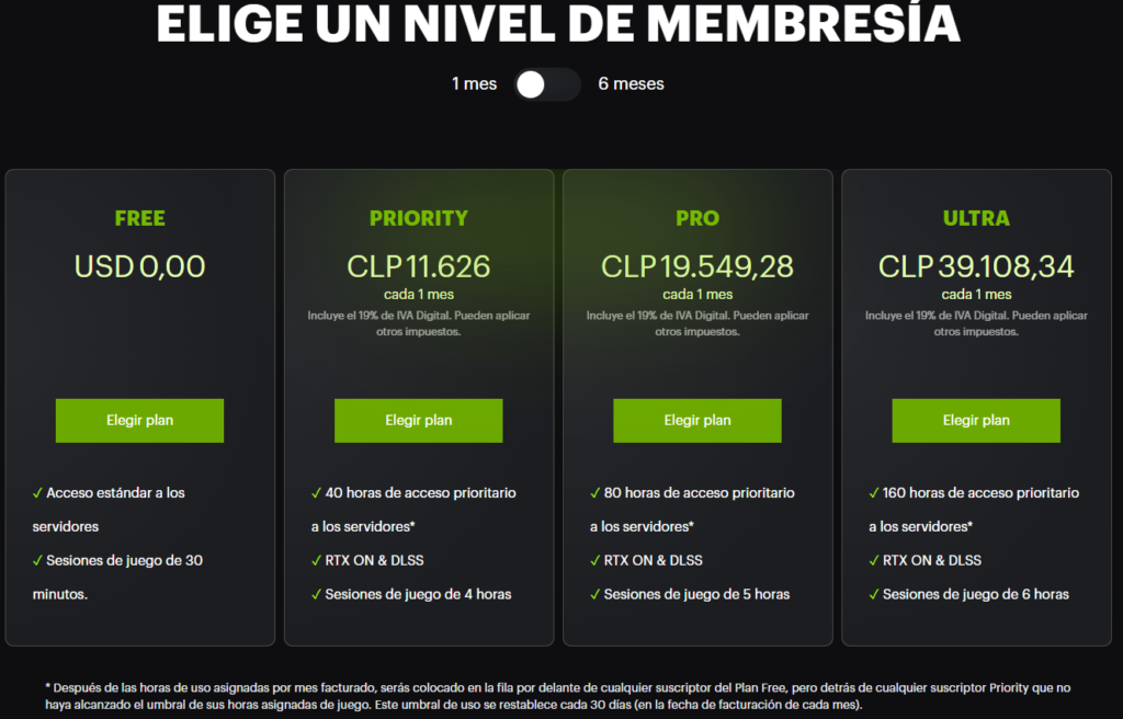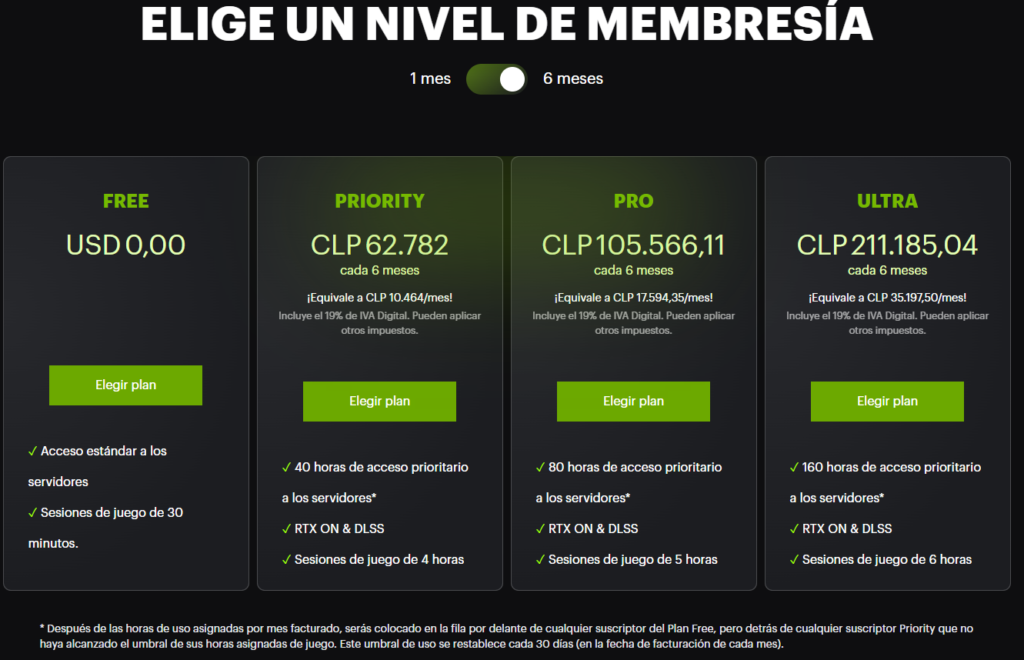 Respecto de sus precios, a continuación, te mostramos los planes disponibles que incluyen membresías de 1 mes o 6 meses, todas renovables. Para otros detalles te invitamos a visitar el sitio oficial de GeForce NOW Powered by ABYA