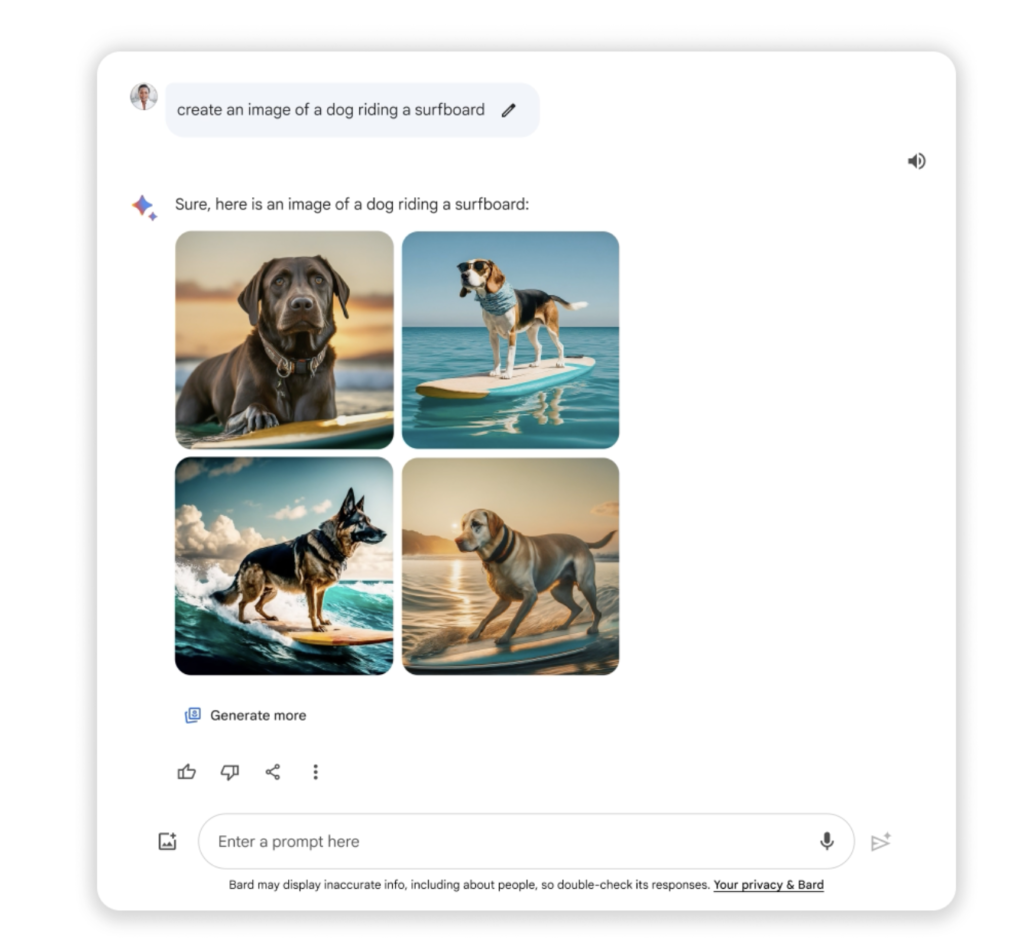 Finalmente, Google también ha incorporado la posibilidad de generar imágenes utilizando Bard, similar a como DALL-E se integró en ChatGPT. En particular, utiliza un modelo de generación de imágenes llamado «Imagen 2», y basta con entregarle un prompt adecuado para que comience a generarlas. Eso sí — como podrán imaginarse — por ahora solo está disponible en inglés.