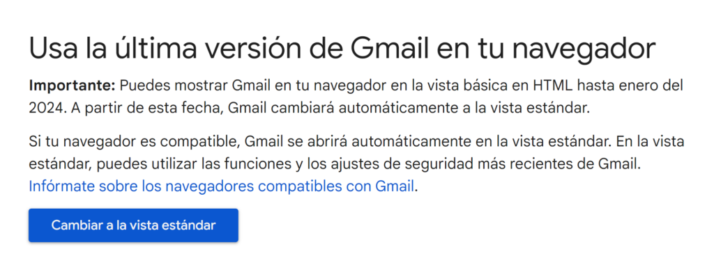 En caso de utilizar una computadora, entonces vamos a tener que usar un cliente de correo electrónico de terceros como Outlook o Apple Mail. Al respecto, Google declaró a The Register que «las vistas HTML básicas de Gmail son versiones anteriores de Gmail que fueron sustituidas por sus sucesoras modernas hace más de 10 años y no incluyen todas las funciones de Gmail.»