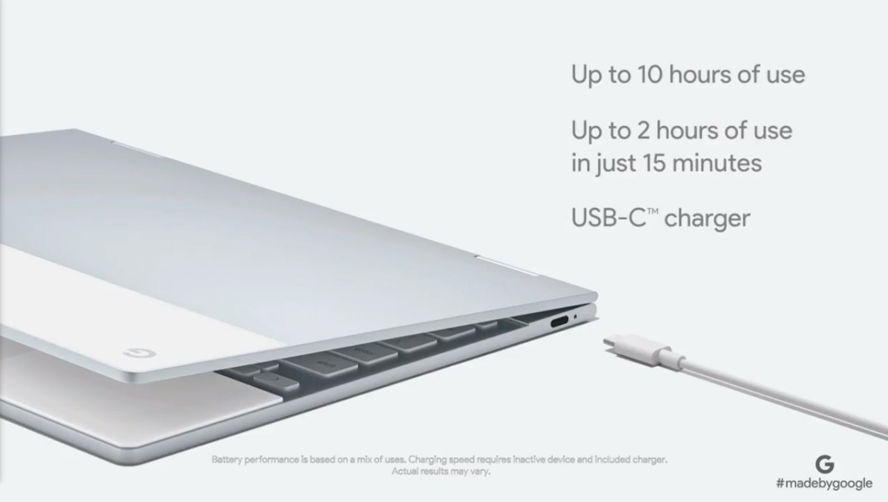 Nos encontramos con una pantalla LCD con resolución QHD de 12.3 pulgadas, un procesador Intel Core i5 o i7, y configuraciones que llegan hasta los 16GB de RAM y 512GB de almacenamiento con SSD. La batería del PixelBook promete durar hasta 10 horas en una sola carga y solo toma 2 horas para cargarlo de 0 a 100. Ah, y puedes utilizar el mismo cargador de tu teléfono Pixel para hacerlo.