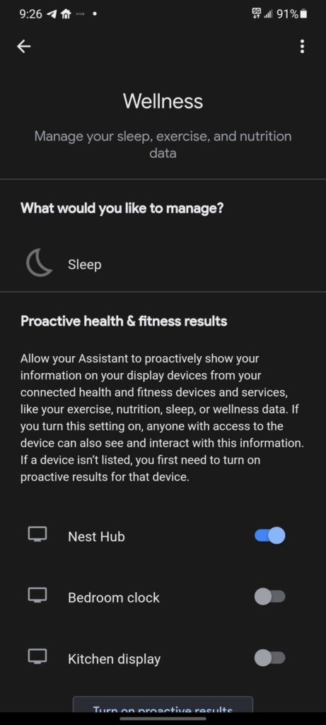 En la sección bienestar, los usuarios podrán agregar servicios o aplicaciones que utilicen para medir su actividad física, sueño, nutrición y demases, como es el caso de Fitbit, la cual es la primera de estas en recibir integración. Esta información se mostrará de forma continua en los dispositivos o apps compatibles con Google Assistant, como es el caso de las pantallas inteligentes Hest Hub, por lo que cualquier persona que interactúe con las pantallas podría tener acceso a los datos del usuario.