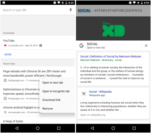 - Función «Tocar para buscar», permite tocar alguna palabra que veas en cualquier página y buscarla en Google en una nueva pestaña.