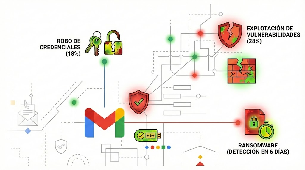 Esta jerarquía no es un hecho aislado, sino la consolidación de una tendencia sostenida. La gráfica “Phishing Declines as an Initial Infection Vector” demuestra cómo el phishing cayó del 22% en 2022 al 14% actual, cruzándose inversamente con el ascenso del robo de credenciales.