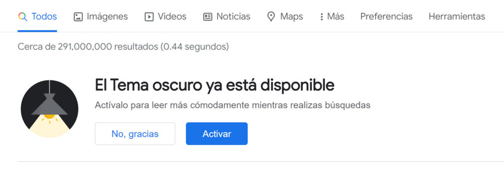 Ahora bien, suponiendo que la suerte estuviera de tu lado, entonces debería figurarte un cuadro con la indicación «el tema oscuro ya está disponible» y te incita a entrar a un botón para su activación. En mi caso concreto y puntual, abrí una pestaña en Chrome en incógnito para realizar una búsqueda que no tenía nada que ver con la temática de este artículo y me «saltó» el aviso: