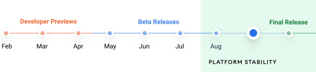 Por ahora, Google ha lanzado la Beta 5 o versión potencial –release candidate en inglés–, la cual es la versión final que llegará a los usuarios y AOSP en caso de que no se encuentren graves errores en ella. Para desarrolladores, esta versión significa que el sistema está listo para que empiecen a actualizar sus aplicaciones para ser compatibles con Android 12 y todas sus nuevas funciones.