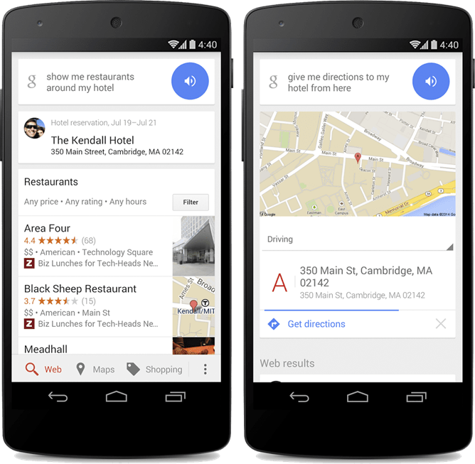 Dado que tu dirección momentánea ya estará registrada, puedes usar comandos de voz como: muéstrame restaurantes cerca de mi hotel. Si, yo estoy pensando lo mismo, esto llega a ser tenebroso de lo preciso que es.